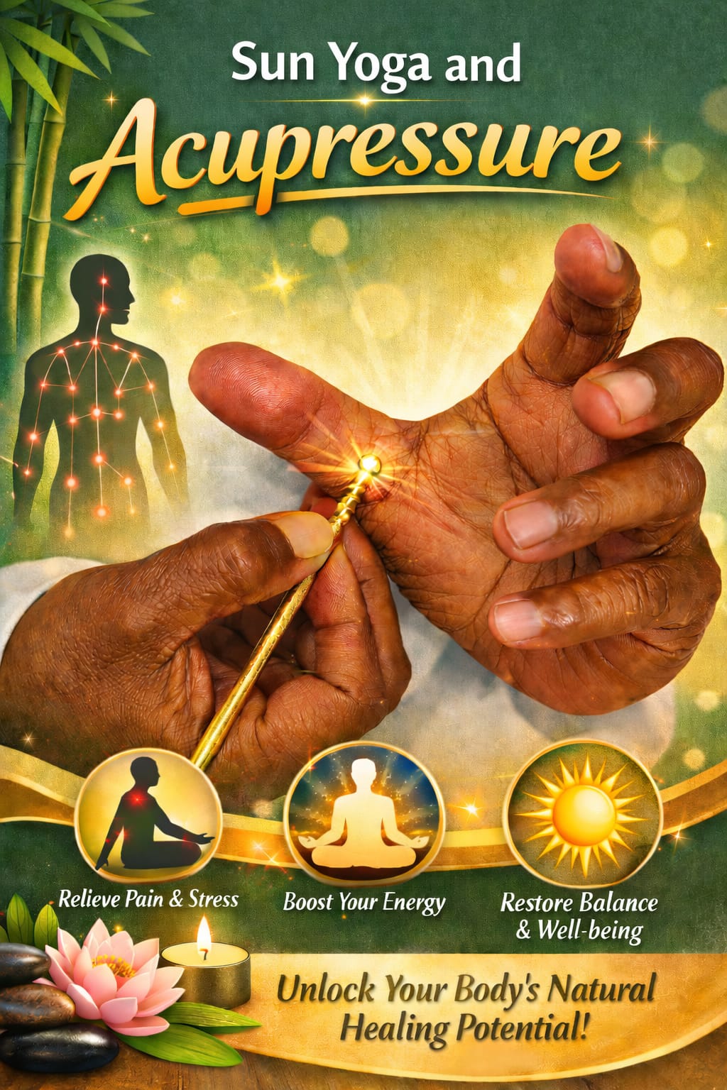 Sunyogi integrates acupressure with Sun Meditation, creating a powerful synergy that enhances healing. By harmonizing the body’s energy systems through meditation and stimulating key pressure points, participants can: